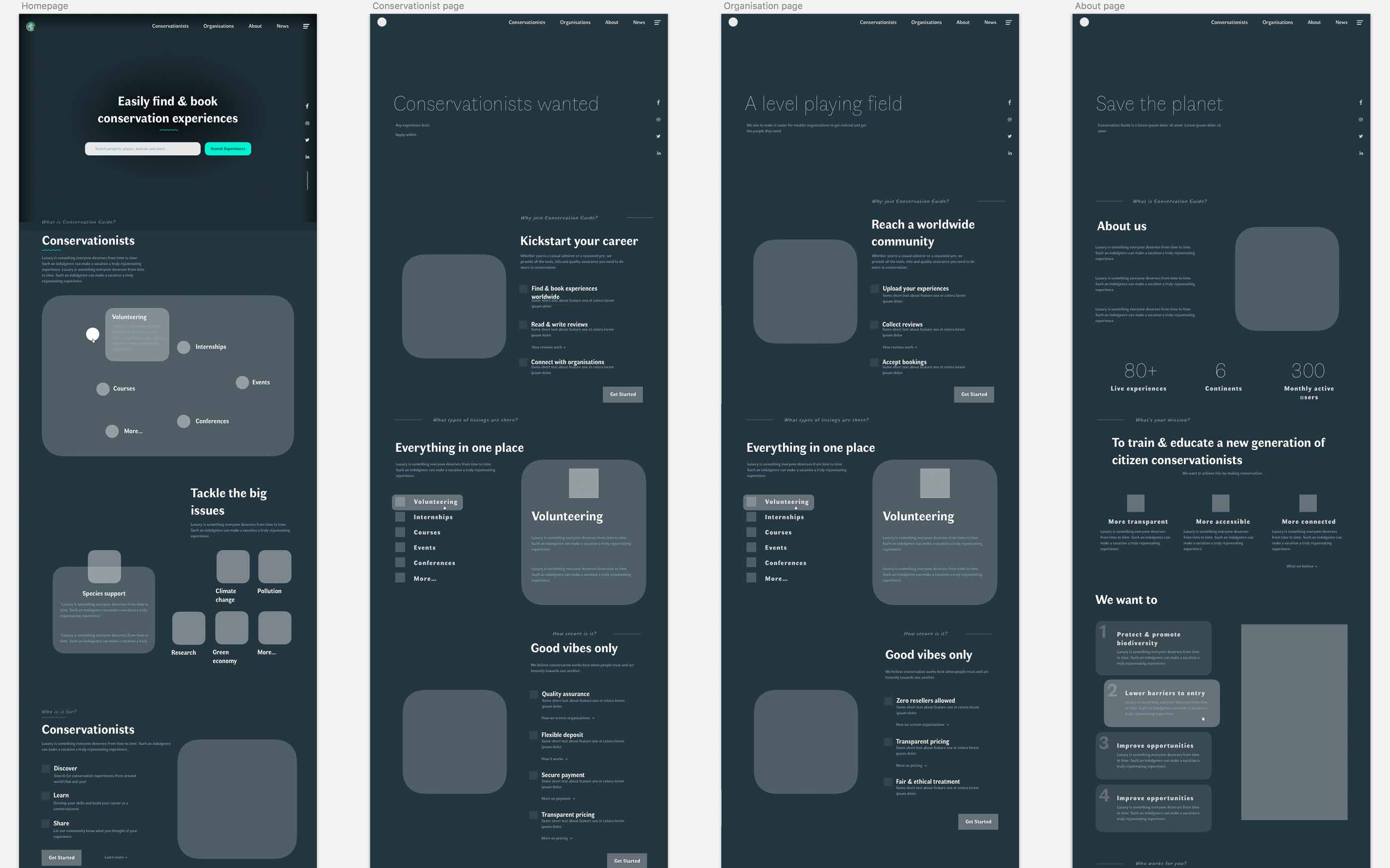 Given that the ocean is my passion and I was my own client for this project, I had a lot of fun with researching different themes. Eventually, we settled on the theme of deep sea bioluminescence because it afforded a striking dark interface that differentiated us from the competition completely. We had learned from research that almost every single eco company uses green, so we decided to make that the one colour to avoid at all costs.